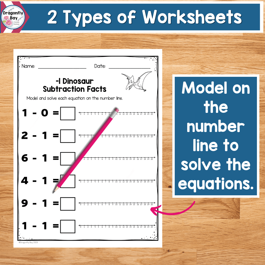 - The second worksheet type has students use a number line to solve for all of the equations. Each of the focus subtraction facts has a different dinosaur themed page.